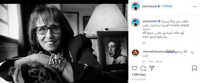 وكتب سميرة سعيد قائلة :"تلقيت خبر وفاة وزيرتنا للثقافة والفنانة الكبيرة ثريا جبران بحزن شديد.. لها مكانة كبيرة في قلبي رحمها الله وأسكنها فسيح جناته".
