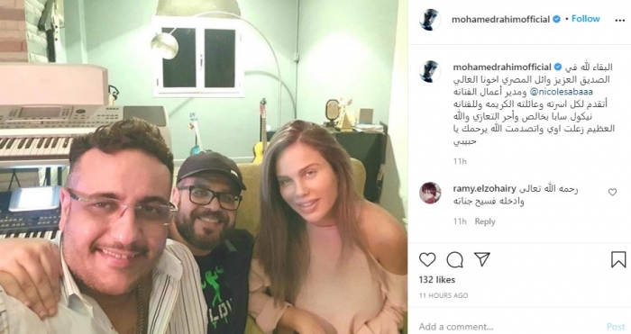 ونشر رحيم صورة تجمعهما، عبر حسابه الرسمي بموقع "إنستجرام"، علق :"البقاء لله في الصديق العزيز وائل المصري، أتقدم لكل أسرته، أخونا الغالي ومدير أعمال الفنانة وعائلته الكريمة وللفنانة نيكول سابا بخالص وأحر التعازي".