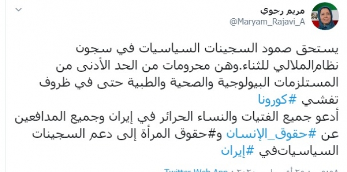وكتبت عبر تغريدة لها على "تويتر" رصدها " المشهد العربي": "يستحق صمود السجينات السياسيات في سجون نظام الملالي للثناء، وهن محرومات من الحد الأدنى من المستلزمات البيولوجية والصحية والطبية حتى في ظروف تفشي كورونا، أدعو جميع الفتيات والنساء الحرائر في إيران وجميع المدافعين عن حقوق الإنسان و حقوق المرأة إلى دعم السجينات السياسيات في إيران".
