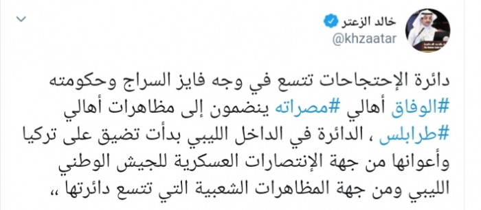 وكتب عبر تغريدة له على "تويتر" رصدها " المشهد العربي" : "دائرة الاحتجاحات تتسع في وجه فايز السراج وحكومته الوفاق، أهالي مصراتة ينضمون إلى مظاهرات أهالي طرابلس، الدائرة في الداخل الليبي بدأت تضيق على تركيا وأعوانها من جهة الانتصارات العسكرية للجيش الوطني الليبي ومن جهة المظاهرات الشعبية التي تتسع دائرتها".