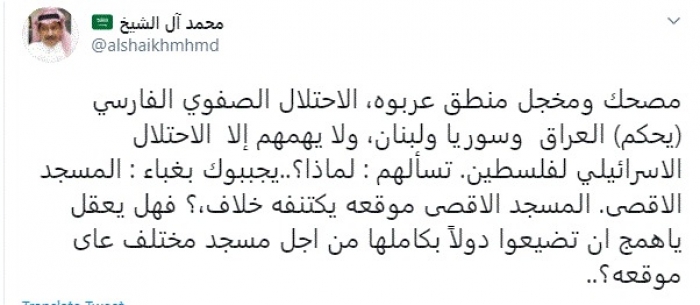وقال في تغريدة عبر "تويتر" رصدها "المشهد العربي": "مضحك ومخجل منطق عربوه، الاحتلال الصفوي الفارسي (يحكم) العراق وسوريا ولبنان، ولا يهمهم إلا الاحتلال الاسرائيلي لفلسطين".