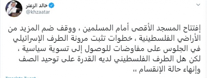 وقال في تغريدة عبر "تويتر" رصدها "المشهد العربي": "افتتاح المسجد الأقصى أمام المسلمين، ووقف ضم المزيد من الأراضي الفلسطينية، خطوات تثبت مرونة الطرف الإسرائيلي في الجلوس على مفاوضات للوصول إلى تسوية سياسية ، لكن هل الطرف الفلسطيني لديه القدرة على توحيد الصف وإنهاء حالة الانقسام".