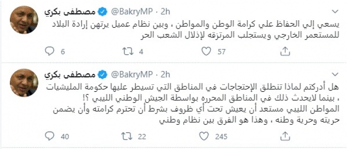 وقال في تغريدات عبر "تويتر" رصدها "المشهد العربي": "هل أدركتم لماذا تنطلق الاحتجاجات في المناطق التي تسيطر عليها حكومة المليشيات، بينما لا يحدث ذلك في المناطق المحرره بواسطة الجيش الوطني الليبي".