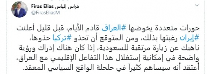 وقال في تغريدة عبر "تويتر" رصدها "المشهد العربي": "حورات متعددة يخوضها العراق قادم الأيام، قبل قليل أعلنت إيران رغبتها بذلك، ومن المتوقع أن تحذو تركيا حذوها، ناهيك عن زيارة مرتقبة للسعودية، إذا كان هناك إدراك ورؤية واضحة في إمكانية إستغلال هذا التفاعل الإقليمي مع العراق، أعتقد أنه سيساهم كثيراً في حلحلة الواقع السياسي المعقد".