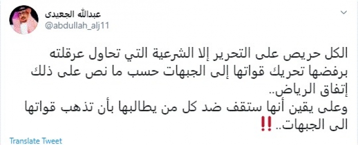 وقال في تغريدة عبر "تويتر" رصدها "المشهد العربي": "الكل حريص على التحرير إلا الشرعية التي تحاول عرقلته برفضها تحريك قواتها إلى الجبهات حسب ما نص على ذلك اتفاق الرياض".