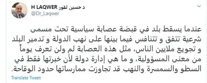 وقال في تغريدة عبر "تويتر" رصدها "المشهد العربي": "عندما يسقط بلد في قبضة عصابة سياسية تحت مسمى شرعية تتفق وتتنافس فيما بينها على نهب الدولة وتدمير البلد وتجويع ملايين الناس".