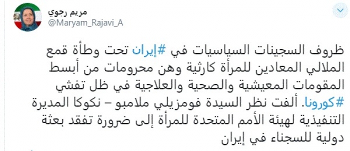 وكتبت في تغريدة عبر "تويتر" رصدها "المشهد العربي": "ظروف السجينات السياسيات في إيران تحت وطأة قمع الملالي المعادين للمرأة كارثية وهن محرومات من أبسط المقومات المعيشية والصحية والعلاجية في ظل تفشي كورونا. ألفت نظر السيدة فومزيلي ملامبو – نكوكا المديرة التنفيذية لهيئة الأمم المتحدة للمرأة إلى ضرورة تفقد بعثة دولية للسجناء في إيران".