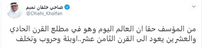وقال في تغريدة عبر "تويتر" رصدها "المشهد العربي": "من المؤسف حقاً أن العالم اليوم وهو في مطلع القرن الحادي والعشرين يعود إلى القرن الثامن عشر.. أوبئة وحروب وتخلف".