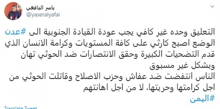 وقال في تغريدة عبر "تويتر" رصدها "المشهد العربي": "التعليق وحده غير كافي يجب عودة القيادة الجنوبية إلى عدن".