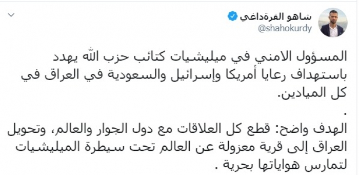 وكتب عبر تغريدة له على "تويتر" رصدها " المشهد العربي": "المسؤول الأمني في مليشيات كتائب حزب الله يهدد باستهداف رعايا أمريكا وإسرائيل والسعودية في العراق في كل الميادين، الهدف واضح، قطع كل العلاقات مع دول الجوار والعالم، وتحويل العراق إلى قرية معزولة عن العالم تحت سيطرة الميليشيات لتمارس هواياتها بحرية".