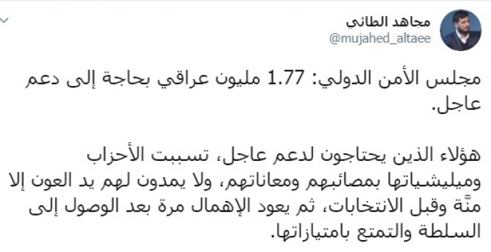 وكتب عبر تغريدة له على "تويتر" رصدها " المشهد العربي": "مجلس الأمن الدولي، 1.77 مليون عراقي بحاجة إلى دعم عاجل، هؤلاء الذين يحتاجون لدعم عاجل، تسببت الأحزاب وميليشياتها بمصائبهم ومعاناتهم، ولا يمدون لهم يد العون إلا منَّة وقبل الانتخابات، ثم يعود الإهمال مرة بعد الوصول إلى السلطة والتمتع بامتيازاتها".