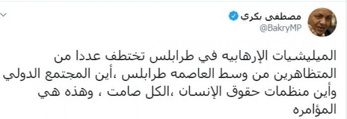 قال البرلماني والإعلامي المصري، مصطفى بكري، إن المليشيات الإرهابية اختطفت عدد من المتظاهرين من وسط العاصمة طرابلس.