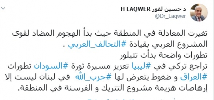 وكتب عبر تغريدة له على "تويتر" رصدها " المشهد العربي": "تغيرت المعادلة في المنطقة حيث بدأ الهجوم المضاد لقوى المشروع العربي بقيادة التحالف العربي، تطورات واضحة بدأت تتبلور تراجع تركي في ليبيا تعزيز مسيرة ثورة السودان تطورات العراق و ضغوط يتعرض لها حزب الله في لبنان ليست إلا إرهاصات هزيمة مشروع التتريك والفرسنة في المنطقة".
