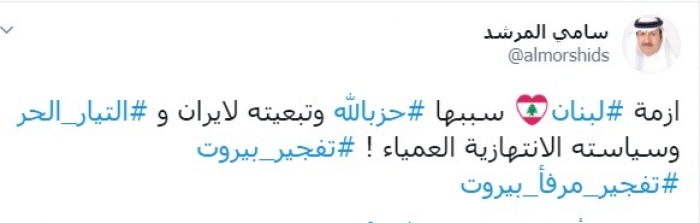 وكتب عبر تغريدة له على "تويتر" رصدها " المشهد العربي": "أزمة لبنان سببها حزب الله وتبعيته لإيران و التيار الحر وسياسته الانتهازية العمياء".
