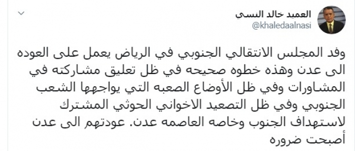 أكد الكاتب والمحلل العسكري، العميد خالد النسي، اليوم الخميس، أن عودة وفد المجلس الانتقالي الجنوبي من الرياض أصبحت ضرورة.