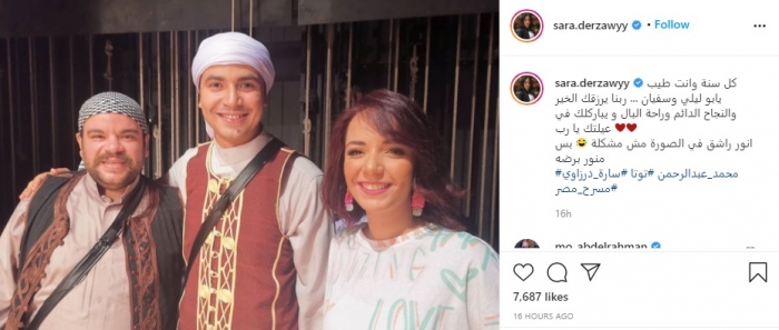 نشرت الفنانة سارة درزاوي صورة تجمعها بالفنان محمد عبدالرحمن "توتا" من أحد عروض مسرح مصر.