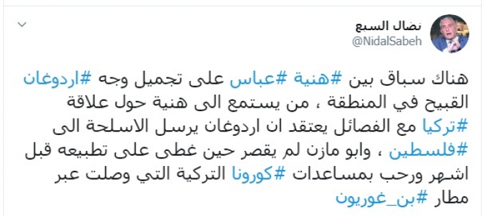 وكتب عبر تغريدة له على "تويتر" رصدها " المشهد العربي": "هناك سباق بين هنية وعباس على تجميل وجه أردوغان القبيح في المنطقة، من يستمع إلى هنية حول علاقة تركيا مع الفصائل يعتقد أن أردوغان يرسل الأسلحة إلى فلسطين، وأبومازن لم يقصر حين غطى على تطبيعه قبل أشهر ورحب بمساعدات كورونا التركية التي وصلت عبر مطاربن غوريون".