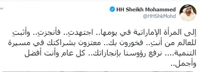وكتب عبر تغريدة له على "تويتر" رصدها " المشهد العربي": "إلى المرأة الإماراتية في يومها، اجتهدتِ، فأنجزتِ، وأثبتِ للعالم من أنتِ، فخورون بك، معتزون بشراكتك في مسيرة التنمية، نرفع رؤوسنا بإنجازاتك، كل عام وأنت أفضل وأجمل".