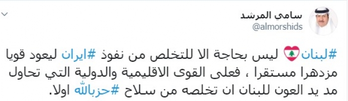 وكتب عبر تغريدة له على "تويتر" رصدها " المشهد العربي": "لبنان ليس بحاجة إلا للتخلص من نفوذ ايران ليعود قويا مزدهرا مستقرا ، فعلى القوى الاقليمية والدولية التي تحاول مد يد العون للبنان أن تخلصه من سلاح حزب الله أولا".