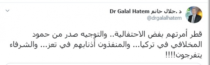 وكتب عبر تغريدة له على "تويتر" رصدها " المشهد العربي":"قطر أمرتهم بفض الاحتفالية، والتوجيه صدر من حمود المخلافي في تركيا، والمنفذون أذنابهم في تعز والشرفاء يتفرجون".