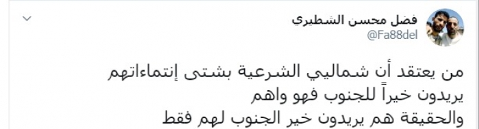 وكتب عبر تغريدة له على "تويتر" رصدها " المشهد العربي": "من يعتقد أن شماليي الشرعية بشتئ انتماءاتهم يريدون خيرًا للجنوب فهو واهم والحقيقة هم يريدون خير الجنوب لهم فقط".