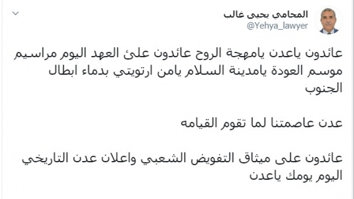 وكتب عبر تغريدة له على "تويتر" رصدها " المشهد العربي": "عائدون يا عدن يا مهجة الروح عائدون على العهد، اليوم مراسيم موسم العودة يا مدينة السلام يامن ارتويتي بدماء أبطال الجنوب، عدن عاصمتنا لما تقوم القيامة، عائدون على ميثاق التفويض الشعبي وإعلان عدن التاريخي اليوم يومك يا عدن".