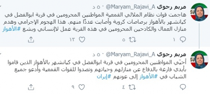 وكتبت عبر تغريدة لها على "تويتر" رصدها " المشهد العربي": "هاجمت قوات نظام الملالي القمعية المواطنين المحرومين في قرية أبوالفضل في كيانشهر بالأحواز برصاصات كروية وأصابت عددًا منهم، هذا الهجوم الإجرامي وهدم منازل العمال والكادحين المحرومين في هذه القرية عمل لاإنساني وبشع".