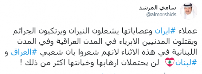 وكتب عبر تغريدة له على "تويتر" رصدها " المشهد العربي": "عملاء إيران وعصاباتها يشعلون النيران ويرتكبون الجرائم ويقتلون المدنيين الأبرياء في المدن العراقية وفي المدن اللبنانية في هذه الأثناء لأنهم شعروا بأن شعبي العراق و لبنان لن يحتملان إرهابها وخيانتها أكثر من ذلك".