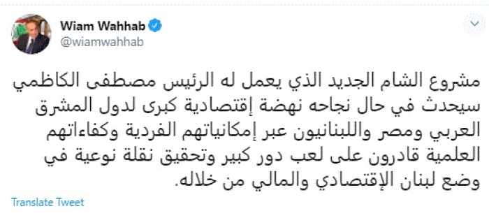 وقال في تغريدة عبر "تويتر" رصدها "المشهد العربي": "مشروع الشام الجديد الذي يعمل له الرئيس مصطفى الكاظمي سيحدث في حال نجاحه نهضة اقتصادية كبرى لدول المشرق العربي".