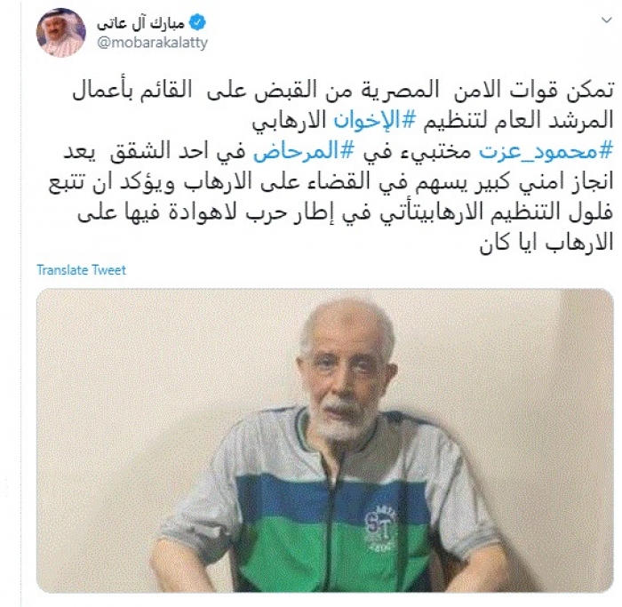 وقال في تغريدة عبر "تويتر" رصدها "المشهد العربي": "تمكن قوات الأمن المصرية من القبض على القائم بأعمال المرشد العام لتنظيم الإخوان الإرهابي محمود عزت مختبيء في المرحاض في أحد الشقق يعد إنجاز أمني كبير".