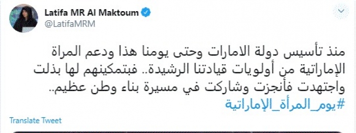 وكتبت في تغريدة عبر "تويتر" رصدها "المشهد العربي": "منذ تأسيس دولة الامارات وحتى يومنا هذا ودعم المراة الإماراتية من أولويات قيادتنا الرشيدة.. فبتمكينهم لها بذلت واجتهدت فأنجزت وشاركت في مسيرة بناء وطن عظيم".