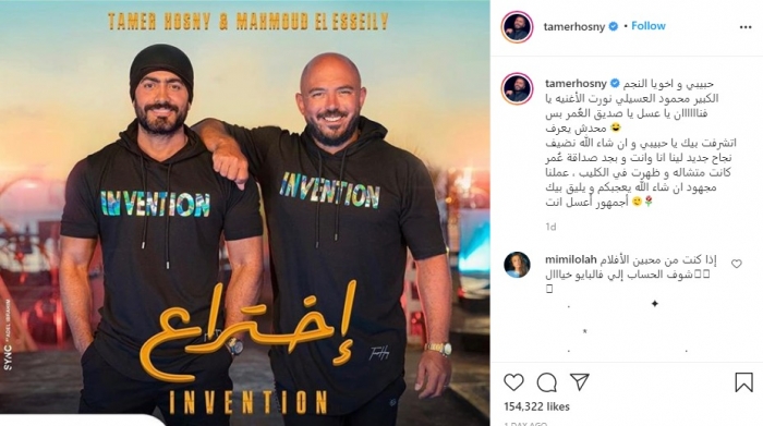 نشر الفنان تامر حسني، عبر حسابه الرسمي بموقع إنستجرام، "البوستر" الدعائي لأغنيته الجديدة "اختراع"، التي تجمعه بالمطرب محمود العسيلي.
