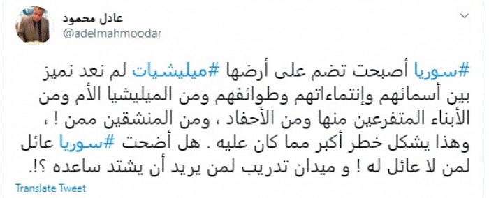 وقال في تغريدة عبر "تويتر" رصدها "المشهد العربي": "سوريا أصبحت تضم على أرضها مليشيات لم نعد نميز بين أسمائهم وإنتماءاتهم وطوائفهم ومن الميليشيا الأم ومن الأبناء المتفرعين منها ومن الأحفاد، ومن المنشقين ممن وهذا يشكل خطر أكبر مما كان عليه".