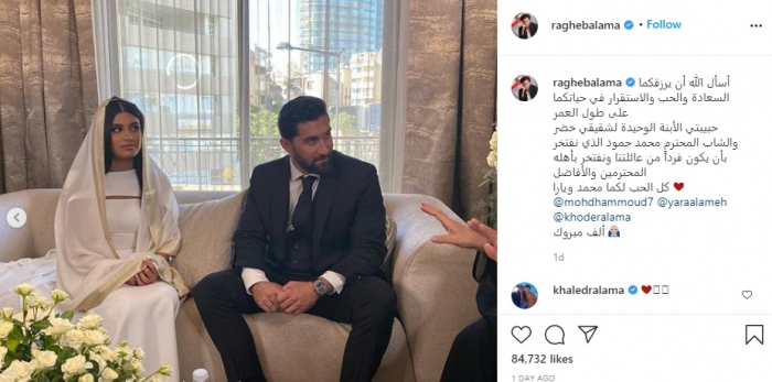 وكتب راغب في تعليقه على الصور، التي ظهرت فيها العروس بجانب عريسها "أسأل الله أن يرزقكما السعادة والحب والاستقرار في حياتكما على طول العمر، حبيبتي الابنة الوحيدة لشقيقي خضر، والشاب المحترم محمد حمود الذي نفتخر بأن يكون فرداً من عائلتنا ونفتخر بأهله المحترمين والأفاضل.. كل الحب لكما محمد ويارا.. ألف مبروك".