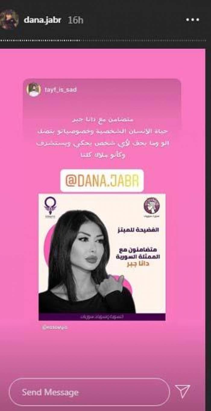 وتفاعل عدد كبير من محبي "دانا"، وأعربوا عن استيائهم من تسريب هذه الصور، كما قدموا لها الدعم من خلال العديد من الرسائل التي نشرتها الفنانة السورية عبر حسابها بـ"إنستجرام".