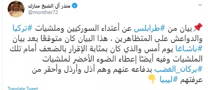 استنكر المدون السعودي البارز منذر آل الشيخ مبارك، اليوم الجمعة، اعتداء المليشيات والمرتزقة على المتظاهرين في العاصمة الليبية طرابلس.