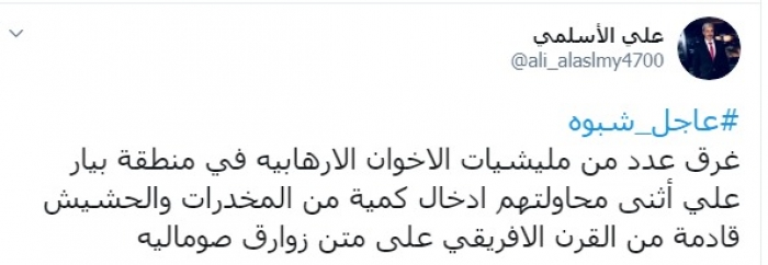 وكتب عبر تغريدة له على "تويتر" رصدها "المشهد العربي": "عاجل شبوة، غرق عدد من مليشيات الإخوان الإرهابية في منطقة بئر علي أثناء محاولتهم إدخال كمية من المخدرات والحشيش قادمة من القرن الإفريقي على متن زوارق صومالية".