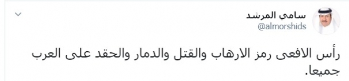 وكتب عبر تغريدة له على "تويتر" رصدها " المشهد العربي": "رأس الأفعى رمز الإرهاب والقتل والدمار والحقد على العرب جميعا".