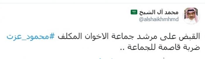 وكتب عبر تغريدة له على "تويتر" رصدها " المشهد العربي": "القبض على مرشد جماعة الإخوان المكلف محمود عزت ضربة قاصمة للجماعة".