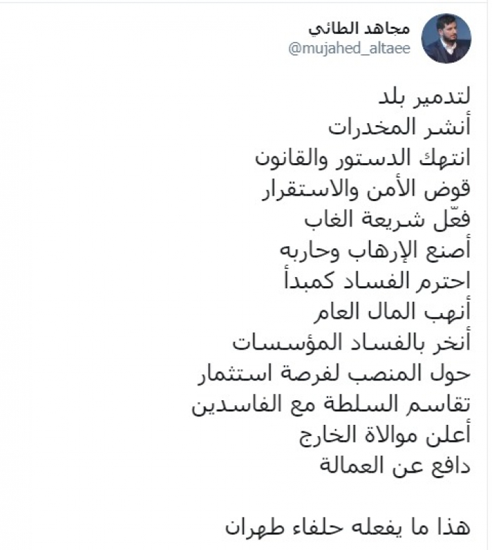 وكتب عبر تغريدة له على "تويتر" رصدها " المشهد العربي": "لتدمير بلد، انشر المخدرات، انتهك الدستور والقانون، قوض الأمن والاستقرار، فعّل شريعة الغاب، اصنع الإرهاب وحاربه، احترم الفساد كمبدأ، انهب المال، العام، انخر بالفساد المؤسسات، حول المنصب لفرصة استثمار، تقاسم السلطة مع الفاسدين، أعلن موالاة الخارج، دافع عن العمالة، هذا ما يفعله حلفاء طهران".
