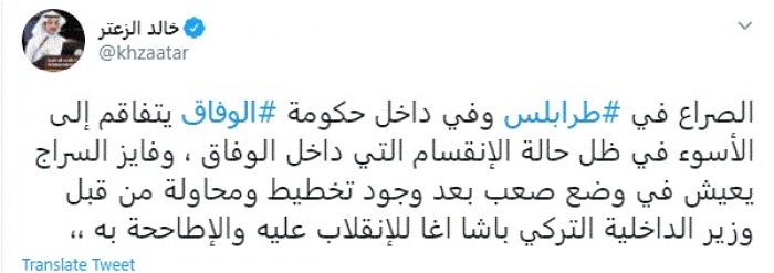 وقال في تغريدة عبر "تويتر" رصدها "المشهد العربي": "الصراع في طرابلس وفي داخل حكومة الوفاق يتفاقم إلى الأسوء في ظل حالة الإنقسام التي داخل الوفاق، وفايز السراج يعيش في وضع صعب بعد وجود تخطيط ومحاولة من قبل وزير الداخلية التركي باشا اغا للإنقلاب عليه والإطاحة به".