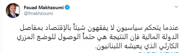 وقال في تغريدة عبر "تويتر" رصدها "المشهد العربي": "عندما يتحكم سياسيون لا يفقهون شيئاً بالإقتصاد بمفاصل الدولة المالية فإن النتيجة هي حتماً الوصول للوضع المزري الكارثي الذي يعيشه اللبنانيون".
