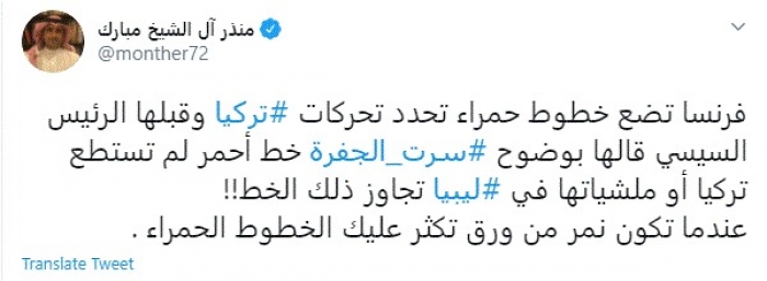 وقال في تغريدة عبر "تويتر" رصدها "المشهد العربي": "فرنسا تضع خطوط حمراء تحدد تحركات تركيا وقبلها الرئيس السيسي قالها بوضوح سرت الجفرة خط أحمر لم تستطع تركيا أو ملشياتها في ليبيا تجاوز ذلك الخط".
