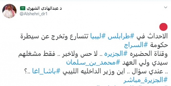 وقال في تغريدة عبر "تويتر" رصدها "المشهد العربي": "الأحداث في طرابلس ليبيا تتسارع وتخرج عن سيطرة حكومة السراج وقناة الحضيرة الجزيرة.. لا حس ولا خبر.. فقط مشغلهم سيدي ولي العهد محمد بن سلمان".