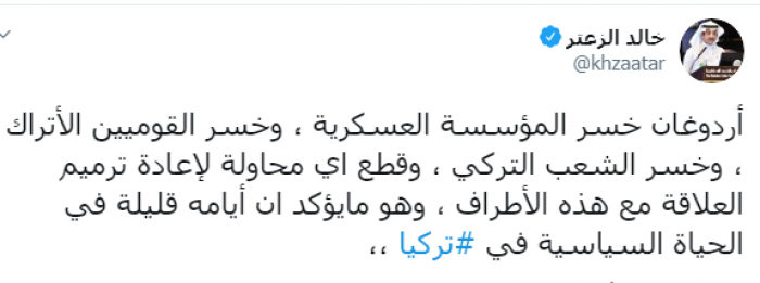 وكتب عبر تغريدة له على "تويتر" رصدها " المشهد العربي": "أردوغان خسر المؤسسة العسكرية، وخسر القوميين الأتراك، وخسر الشعب التركي، وقطع أي محاولة لإعادة ترميم العلاقة مع هذه الأطراف، وهو ما يؤكد أن أيامه قليلة في الحياة السياسية في تركيا".