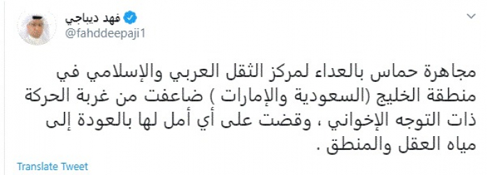 وقال في تغريدة عبر "تويتر" رصدها "المشهد العربي": "مجاهرة حماس بالعداء لمركز الثقل العربي والإسلامي في منطقة الخليج (السعودية والإمارات ) ضاعفت من غربة الحركة ذات التوجه الإخواني ، وقضت على أي أمل لها بالعودة إلى مياه العقل والمنطق".