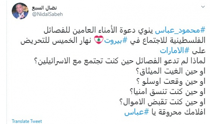 وقال في تغريدة عبر "تويتر" رصدها "المشهد العربي": "محمود عباس ينوي دعوة الأمناء العامين للفصائل الفلسطينية للاجتماع في بيروت نهار الخميس للتحريض على الإمارات.. لماذا لم تدعو الفصائل حين كنت تجتمع مع الإسرائيلين؟ أو حين ألغيت الميثاق؟".
