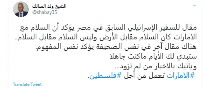 وكتب في تغريدة عبر "تويتر" رصدها "المشهد العربي": "مقال للسفير الإسرائيلي السابق في مصر يؤكد أن السلام مع الامارات كان السلام مقابل الأرض وليس السلام مقابل السلام.. هناك مقال آخر في نفس الصحيفة يؤكد نفس المفهوم".
