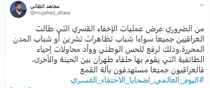 تفاعل الباحث السياسي مجاهد الطائي، اليوم، مع هاشتاج اليوم العالمي لضحايا الاختفاء القسري.
