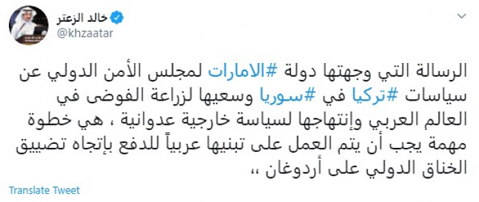 وكتب في تغريدة عبر "تويتر" رصدها "المشهد العربي": "الرسالة التي وجهتها دولة الإمارات لمجلس الأمن الدولي عن سياسات تركيا في سوريا وسعيها لزراعة الفوضى في العالم العربي وإنتهاجها لسياسة خارجية عدوانية، هي خطوة مهمة يجب أن يتم العمل على تبنيها عربياً للدفع باتجاه تضييق الخناق الدولي على أردوغان".